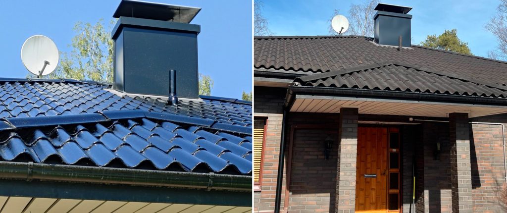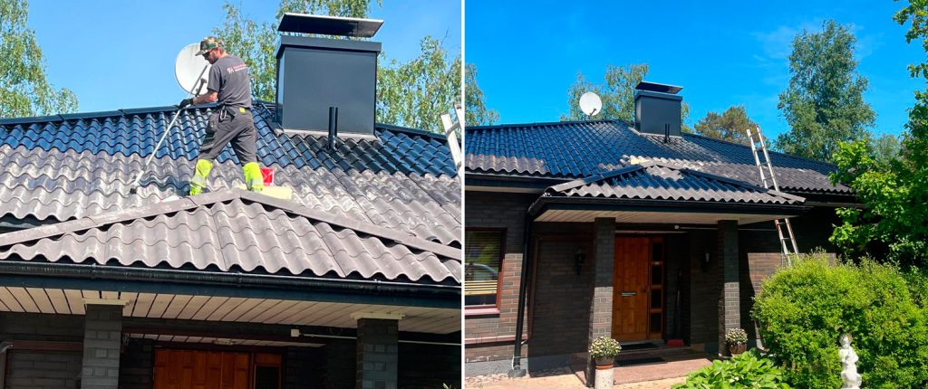Talon omistaja on tyytyväinen lopputulokseen, sillä uusi sävy vastaa hyvin alkuperäisen katon värimaailmaa, ja katon käyttöikää on saatu pidennettyä kohtuullisilla kustannuksilla.